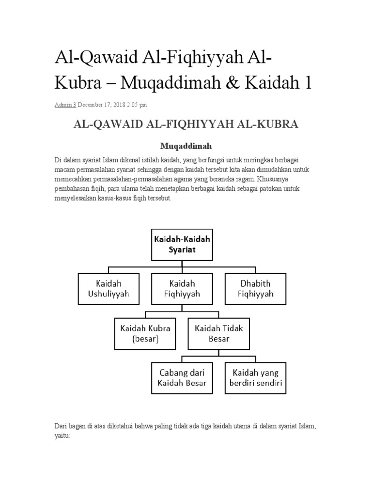 Kaidah-kaidah besar yang mencangkup hampir seluruh bab fiqih islam yaitu اليقيببن ل يببزول بالشببك. Hukum syari dibagi kepada dua macam yaitu 1 Hukum taklifi dan 2 Hukum Wadi. Maka dari itu kami selaku penulis mencoba untuk menerangkan tentang kaidah-kaidah fiqh mulai.