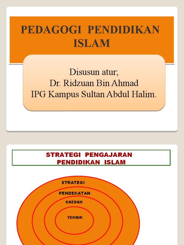 Kemahiran guru mengaplikasikan pendekatan kaedah dan teknik dalam proses pembelajaran dan pengajaran Pendidikan Islam. Antara sumber ilmu tersebut adalah kaedah pengajaran yang digunakan oleh Rasulullah SAW dan para Cendikiawan Islam yang tersohor se antero dunia. Rasional dan Kepentingan Kaedah lawatan yang efektif.