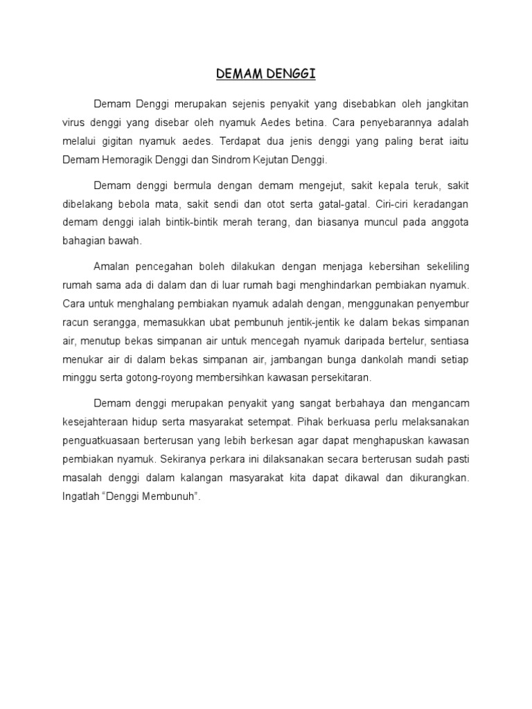 Anda juga boleh mengambil manfaat satu daripada kaedah berikut ini asal saja belum sampai pada tahap denggi berdarah-. Tulis sebuah karangan tentang langkah-langkah menangani demam denggi. -Berkaitan terus pada tempat-tempat pembiakan nyamuk aedesperangkap semutpasu bungabalditempayankolah manditayar buruktempurung kelapabotol atau gelas pecah yang mengandungi airsaluran air hujan.